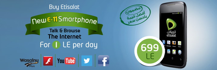 Etisalat offers a new android "Etisalat Smartphone E-11" & "Etisalat Smartphone". You can get your specially tailored "GetSmart" Tariff or the Postpaid Tariff of your choice, along with your favorite apps preloaded on your phone only for 699 L.E. On Getting "Get Smart" for prepaid customer, pay only 1 L.E per day and get 30 minutes per day to Etisalat and 10 MB per day.